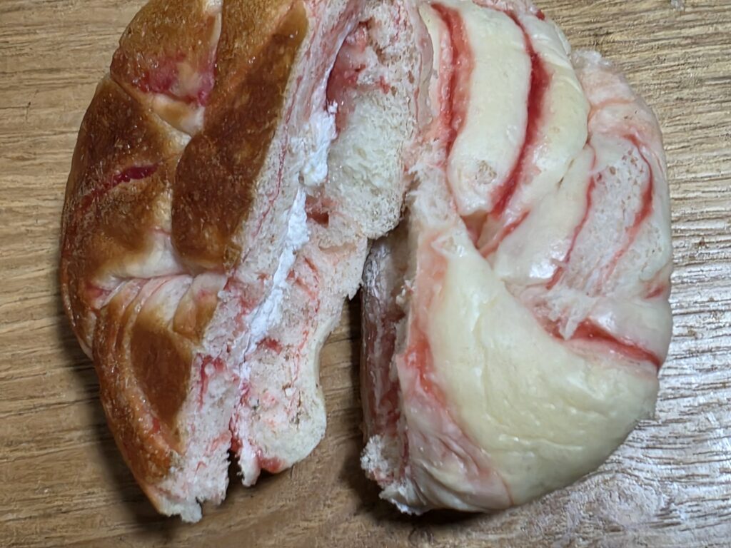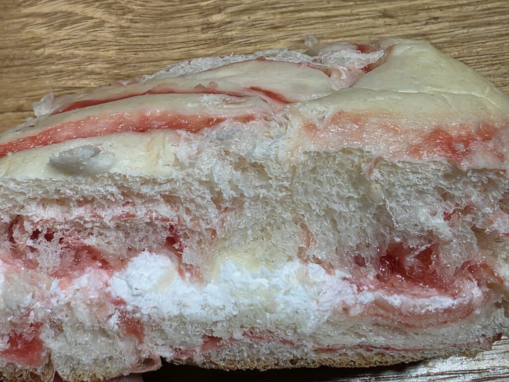 こだわりのあるおいしさ宣言新商品パン。いちごクリームを練り込んだマーブルパンでいちごジャムとホイップクリームをサンドした仕様。さっぱりさわやかな味わいが大変美味しゅうございます。いちごの果肉感ともっちり生地とクリームの甘さのハーモニーが気に入りました。ごちそうさまでした。是非一度お試しくださいませ。